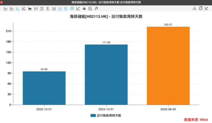 为缓解自身现金流压力,海辰储能通过延长供应商账期转嫁风险,据Wind数据显示,截至2025年6月末,公司的应付账款周转天数达222.37天,远超其承诺的180天结算期。